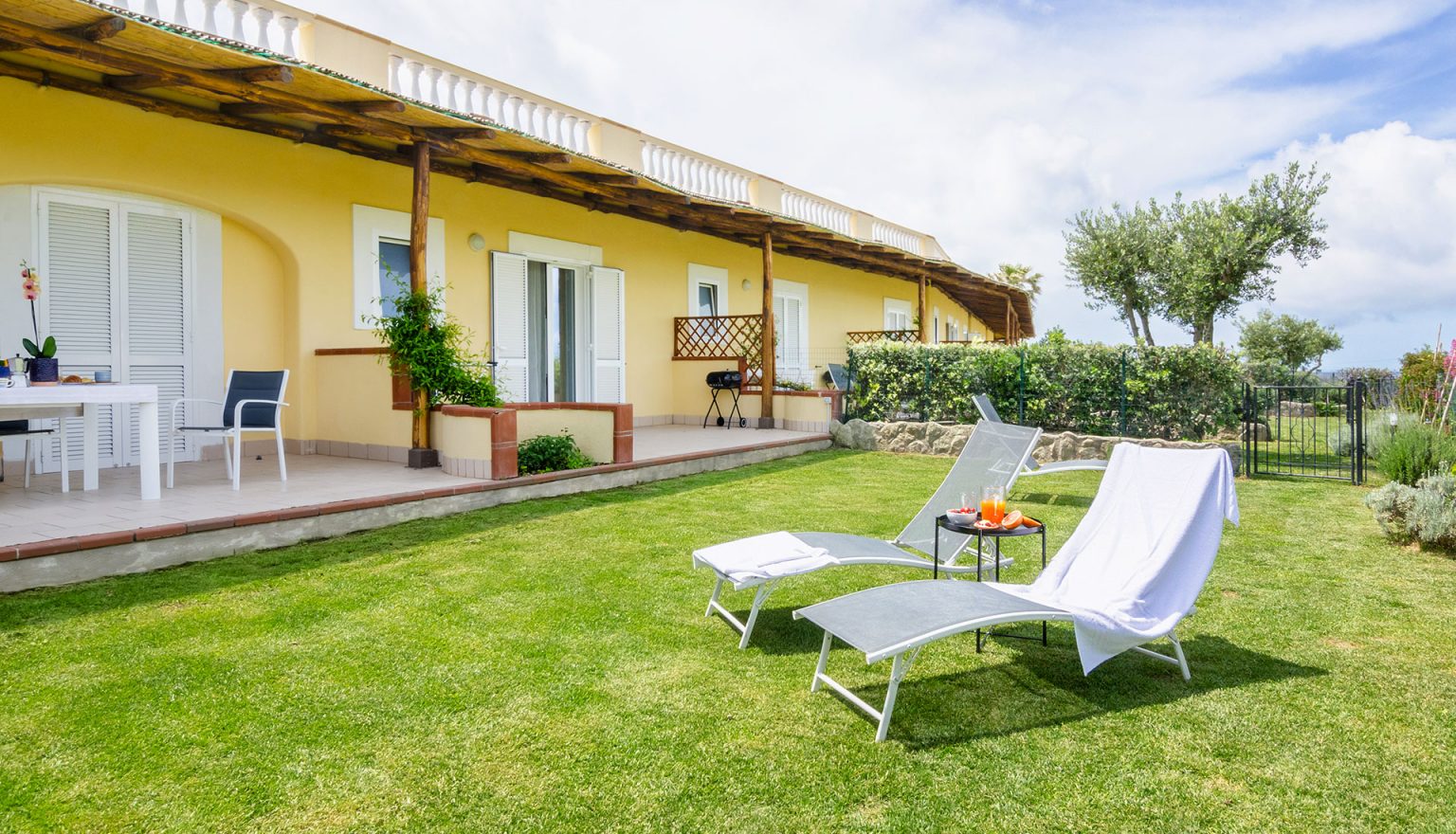Ampi giardini, pergolato esterno con vista e camere da letto ampie e ariose. I nostri trilocali vista mare laterale sono ideali per famiglie o coppie di amici.