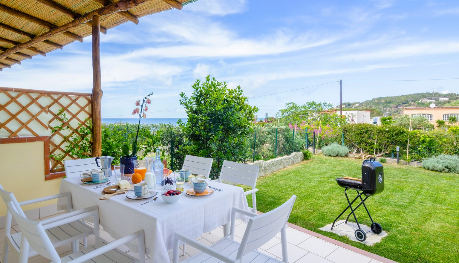 Spazi ariosi, stile fresco e mediterraneo, pergola esterna immersa nel verde da cui si vede il mare
