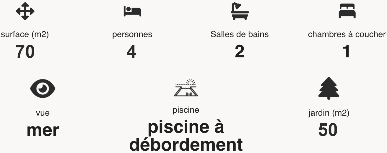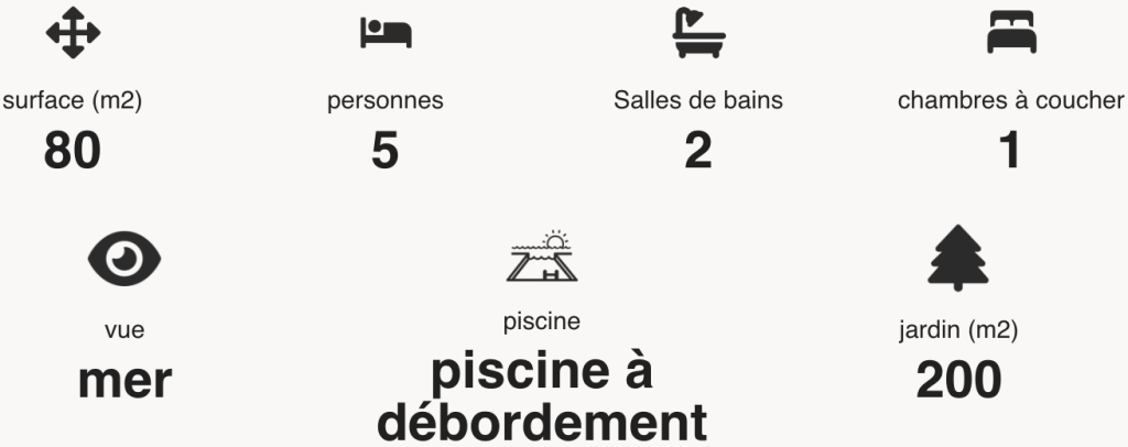 Des espaces lumineux et généreux, un design élégant à l’esprit méditerranéen frais. La grande terrasse donne sur un jardin luxuriant et offre une vue spectaculaire sur la piscine à débordement, la mer et le coucher de soleil.