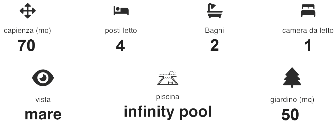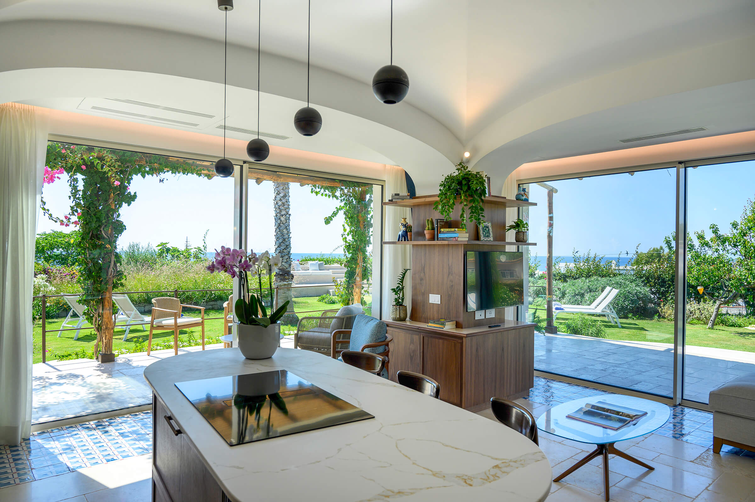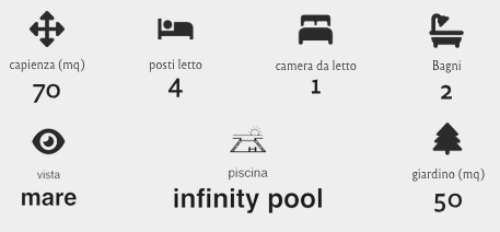 Spazi ampi e luminosi, un elegante design dal tocco fresco e mediterraneo. Il grande terrazzo si affaccia su un rigoglioso giardino, offrendo una vista spettacolare sulla piscina a sfioro, sul mare e sul tramonto.