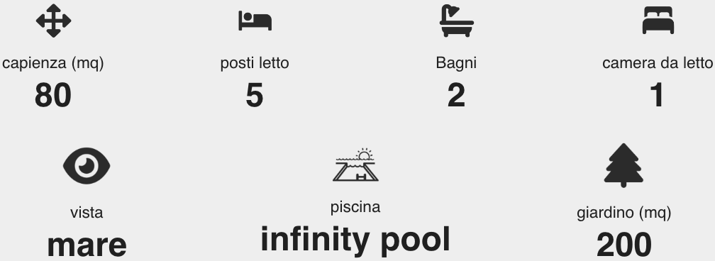 Villa Grande, nata dall’unione delle nostre Villa Zaro e Villa Cartaromana, è una residenza nuovissima in autentico stile mediterraneo: 250 mq fronte mare con 5 camere, 5 bagni, due piscine a sfioro e un giardino privato di 600 mq..